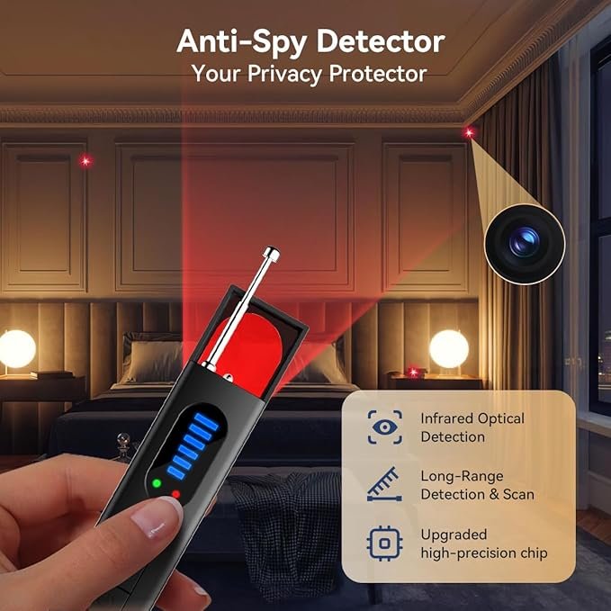 - Comprehensive Protection: Detects both RF signals and magnetic lenses, covering most spy tech.
